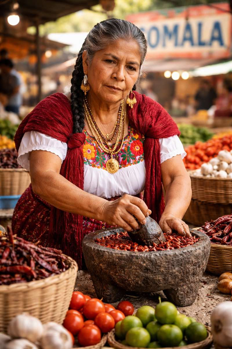 Acomoda en el interior del pesado mortero de basalto un primer puñado de chiles mixe, pequeños y arrugados. Maneja el tejolote con destreza y golpea con precisión los chiles que, al reventar, le arrebatan por un instante el olfato con un punto picoso para soltar, justo después, esa intensa fragancia de madera ahumada, sol y tierra seca, que la estremece y despierta su memoria.