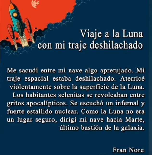 Finalmente conduje mi nave de navegación a las últimas coordenadas que aparecieron en la brújula del mando de control de la cabina. En pantalla se vislumbraba la única alternativa de aterrizaje. Los circuitos seguían fallando y era inminente la colisión con esa superficie térrea presentada a último instante. Direccioné la nave al curso de los puntos cósmicos. Luego perdí el control y todo al impactar me sacudió estrepitosamente. Forrado en traje cibernético puede sobrevivir al impacto de la nave estrellada. Salí de la cápsula y me deshice de mis ropas destrozadas. Luego eché a andar por las dunas, desvalido y herido, y detrás de mí quedó la nave averiada y estrellada.