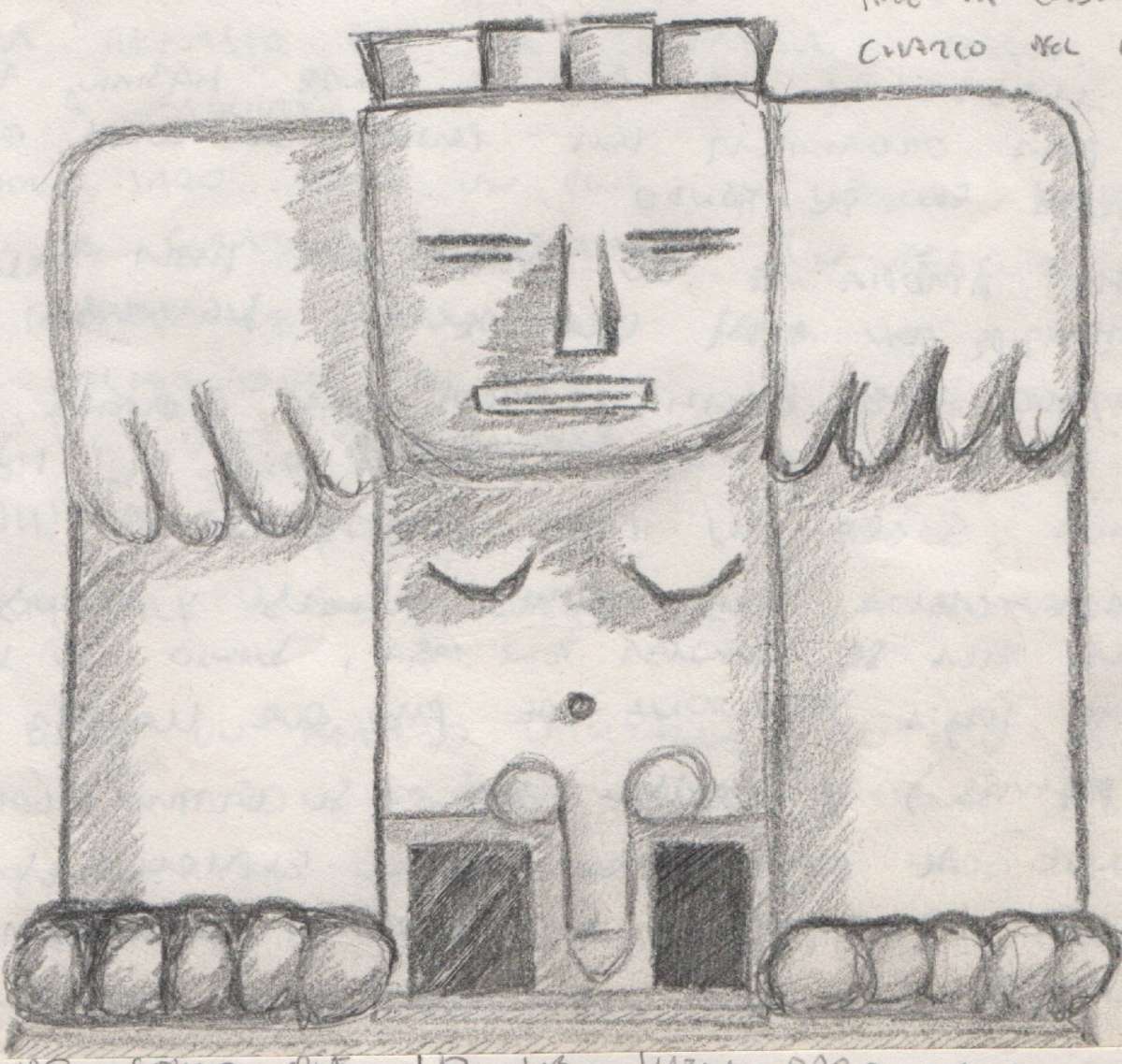 Centro mi atención en el pequeño ídolo que aparece en la imagen y poco a poco su figura se va agrandando y deformando, hasta convertirse en una construcción que representa a alguna divinidad precolombina en cuclillas, esculpida en piedra y de unos 20 metros de alto por otros tantos de ancho.