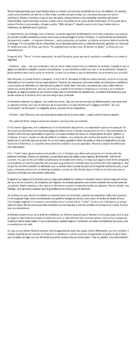 Dormí mal y me levanté a través de un sueño donde Filomena me pedía que devolviera los lápices. Llovía, o la ciudad decidió que su manera de persignarse consistía en desprenderse de la humedad sobre la gente. En la mesa, al lado del ídolo, alguien había puesto un sobre con mi nombre. Dentro, una hoja con letra menuda explicaba que, cada año, aplicadas en el cambio de estaciones, la Miskatonic guardaba un expediente sobre “anomalías fenológicas”. Habían llamado al fenómeno “año sin primavera” para que los diarios se entretuvieran y la gente creyera que se trataba de botánica. En realidad, se trataba de algo más: cada vez que el invierno parecía ceder, la ciudad, como organismo, prefería quedarse en el entretiempo, en esa suspensión que tantas almas consideran, si son honestas, la forma más soportable de existir. La carta concluía con una frase subrayada: “El ídolo es un péndulo de piedra”. No había firma. Sólo un pequeño sello, otra vez la torre.