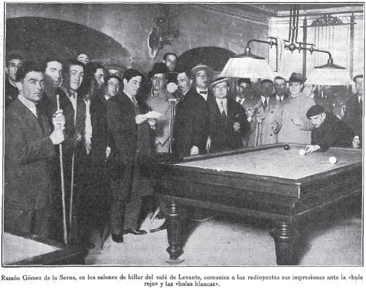 | Fuente: B.N.E. Ramón Gómez de la Serna retransmite por radio una partida de billar en el salón del piso superior del Antiguo café de Levante. (1929). |