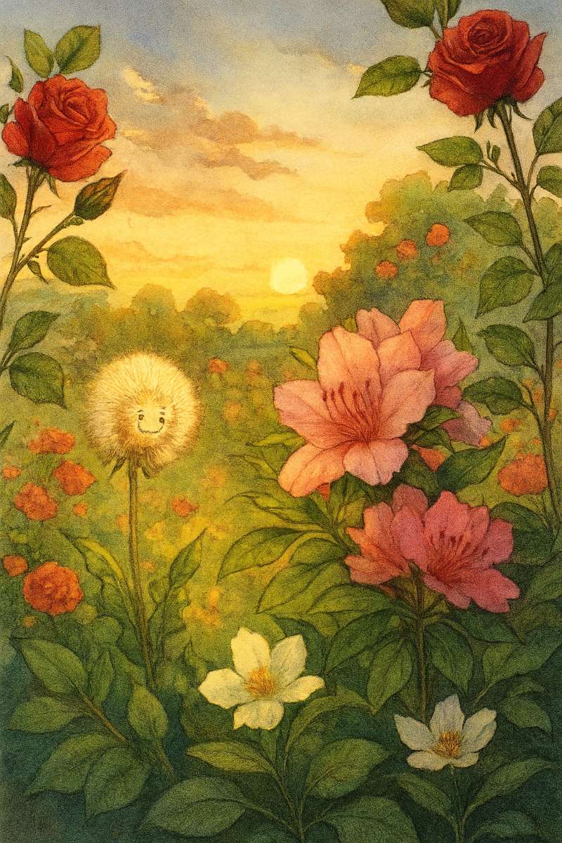Todo cambió una mañana, cuando al salir el sol algunas de las rosas fueron cortadas del jardín, dejando un vacío y rompiendo la cortina que separaba la vista de la pequeña flor de campo. Esa mañana, la florecilla vislumbró un paisaje que nunca antes había podido contemplar por el tamaño de los rosales. El mundo que descubrió era más grande de lo que había imaginado: no era un jardín solo de rosas, había todo tipo de flores, grandes y pequeñas, de distintos colores. A lo lejos, en su dirección, un jovial y tierno diente de león la observó. La saludó con ternura y la reverenció con infantil caballerosidad. La pequeña flor, sorprendida, se escabulló detrás de un rosal, pero sigilosamente observó al diente de león, que hacía todo tipo de monadas para llamar su atención. Finalmente, cayó hechizada por su peculiar forma de ser.