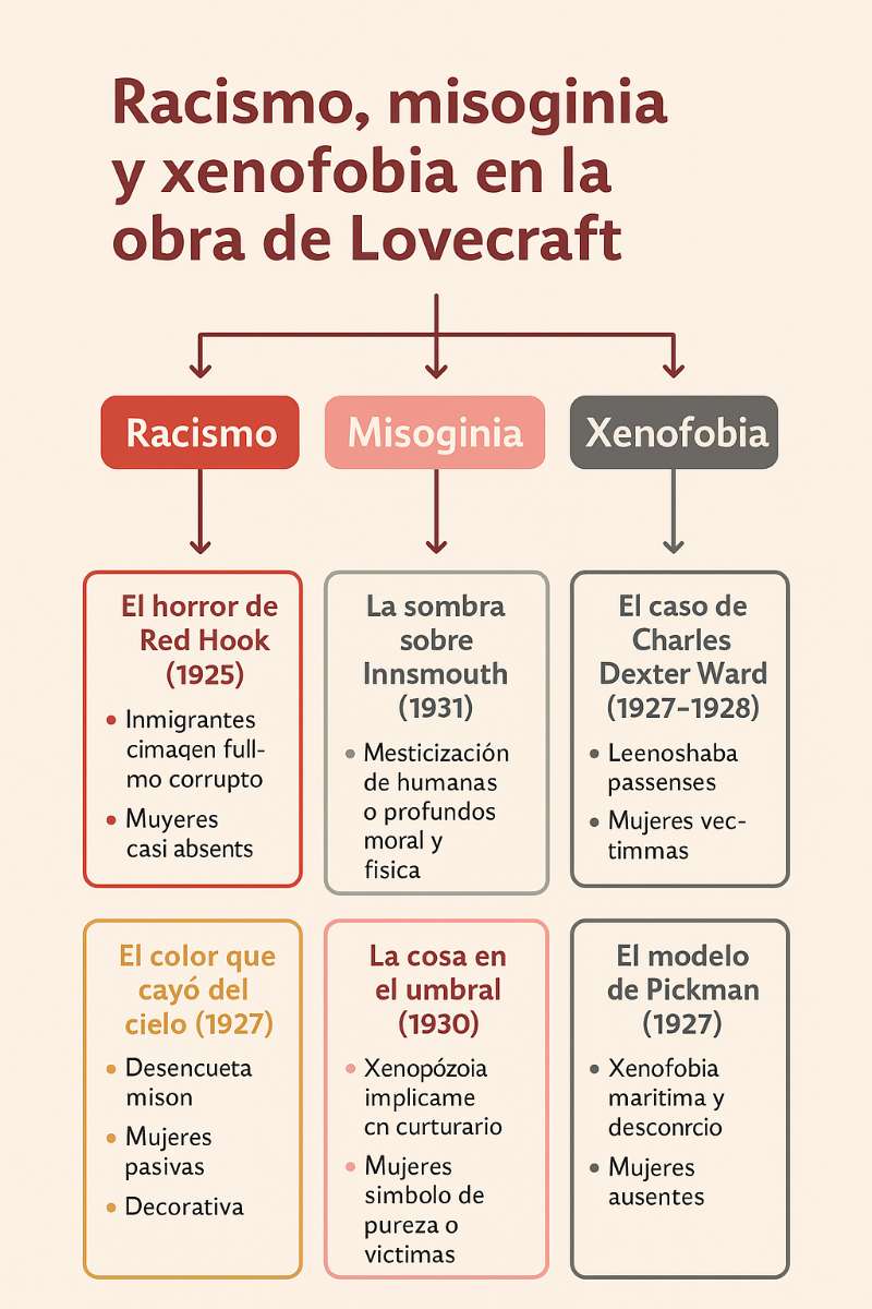Vamos a hacer un mapa-resumen de los cuentos más importantes de Lovecraft, señalando dónde aparecen racismo, misoginia/machismo y xenofobia, y cómo influyen en la historia.